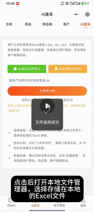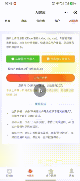 点点库存AI建库功能为企业用户提供智能化的商品信息批量导入服务。通过先进的AI解析技术,系统能够自动识别Excel表格中的商品数据,大幅提升信息录入效率,降低人工操作成本。